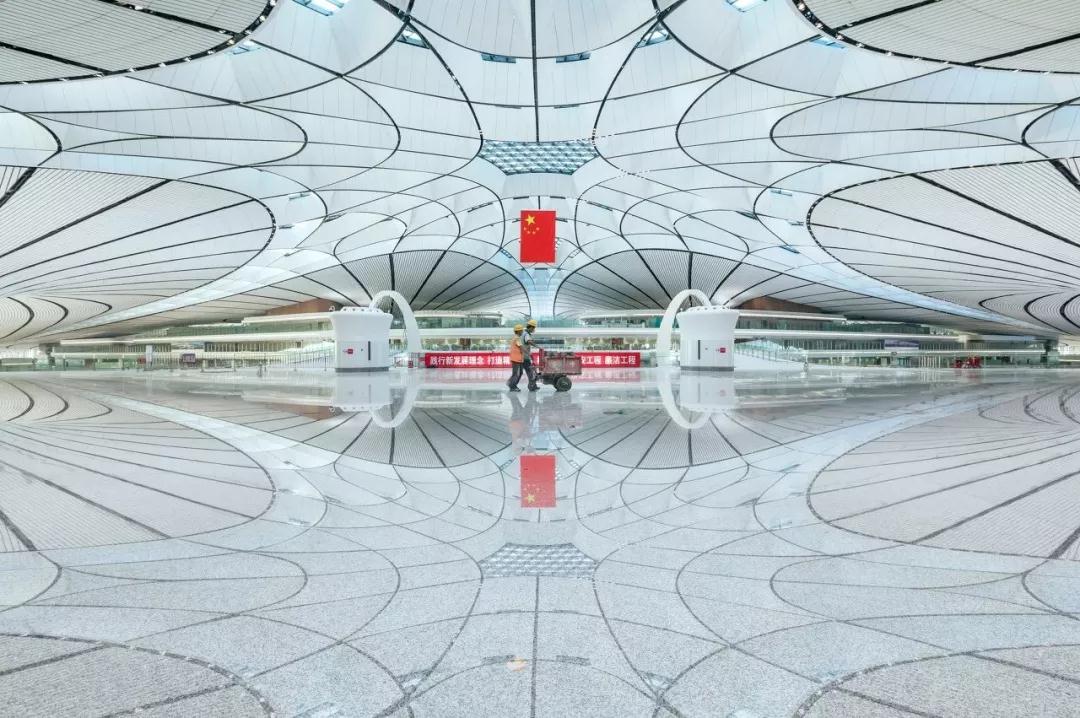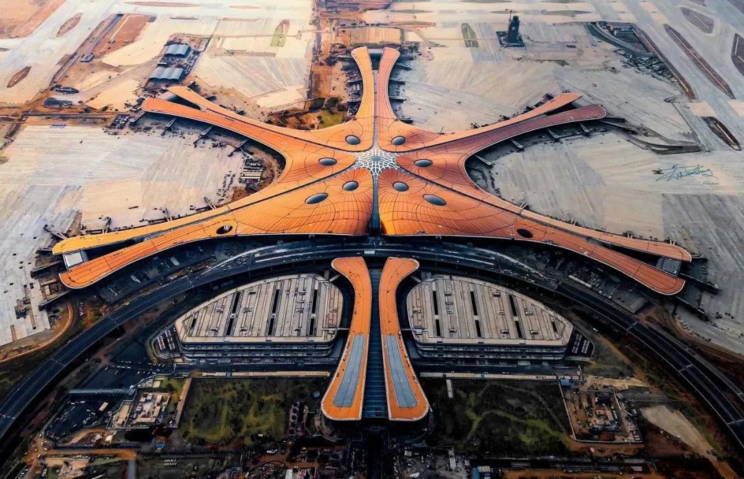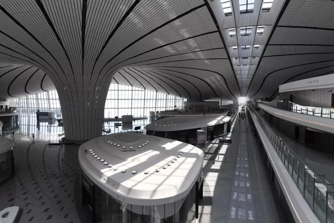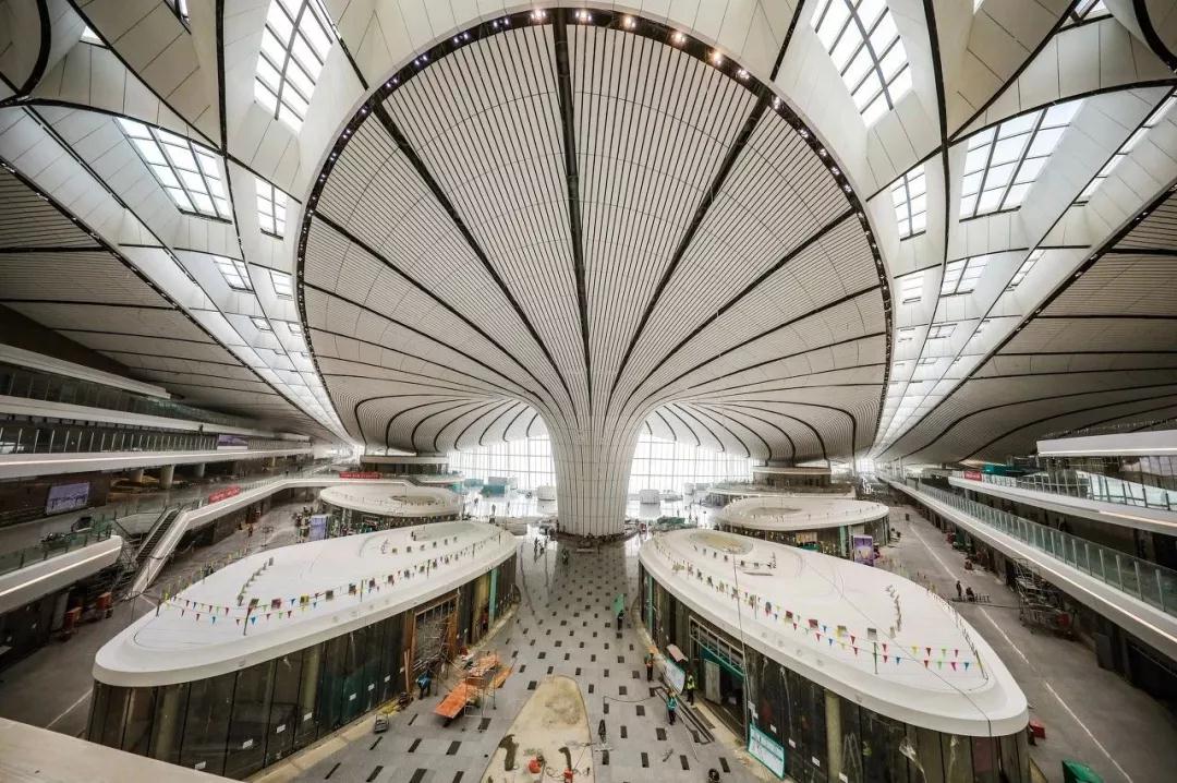 以扎哈的北京大興國際機場為例。如果我們從空中鳥瞰大興機場的棚頂結(jié)構(gòu),會覺得有點兒酷似六芒星的結(jié)構(gòu)。但是,如果我們對它的曲面進行劃分,可以發(fā)現(xiàn),這座建筑也是由“葉狀結(jié)構(gòu)”所形成的。實際上看它內(nèi)部的鋼架結(jié)構(gòu),里面由兩簇彼此垂直的曲線結(jié)構(gòu)組成,結(jié)構(gòu)中間存在一個穩(wěn)定的奇異點。