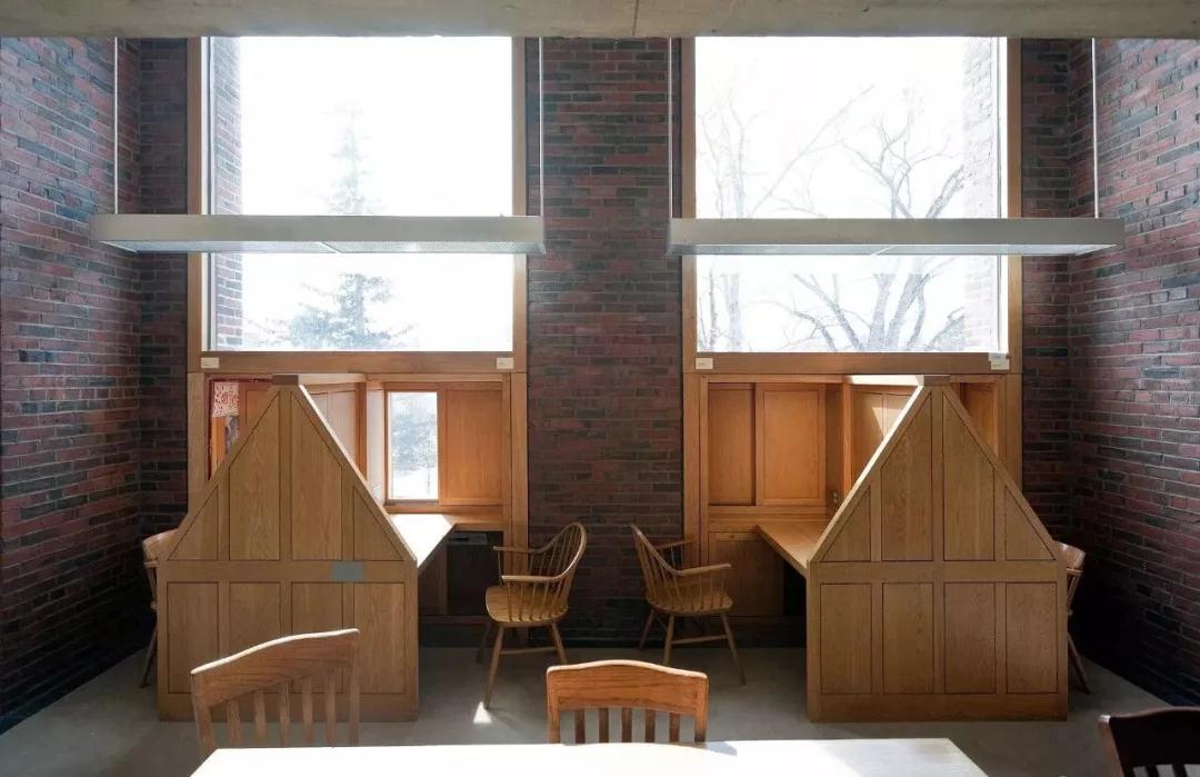 作為路易斯康的經(jīng)典之作,表達了極強的幾何感,對稱感,呈現(xiàn)出一種理性的美。外表方正、內(nèi)部分隔出閱覽、藏書、中庭三層結(jié)構(gòu)。中庭的墻面上挖了4個巨型圓洞,人與巨型圓洞在尺度上形成鮮明對比,顯示出人的渺小。閱覽區(qū)的三角形獨立座位,劃分出靜謐的私人空間。方形、圓形、三角形在這部作品里的運用,營造出一種靜態(tài)的空間氛圍,非常符合圖書館空間的設計需求。