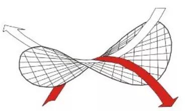 雙曲拋物面是羅氏幾何的一個重要模型。每個面上都有兩條拋物線,形成的結(jié)構(gòu)既能抗壓也能抗拉。又因形狀酷似馬鞍,也被稱作“馬鞍面”。它的重要特征——直紋曲面,即它可看成由兩族直線構(gòu)成。這個特點為后期施工帶來極大的便利性。(我們常吃的某些薯片就是馬鞍面哦)