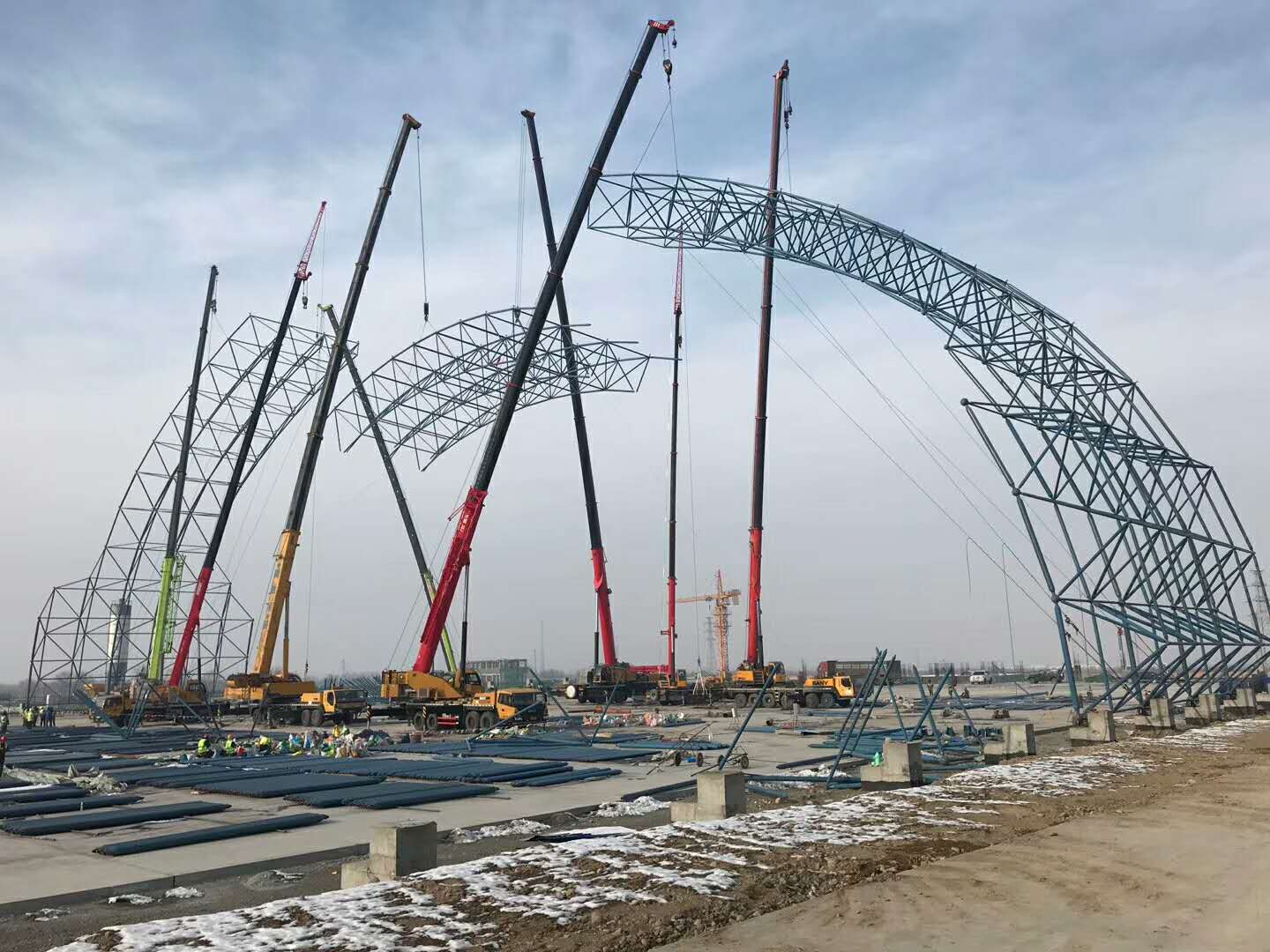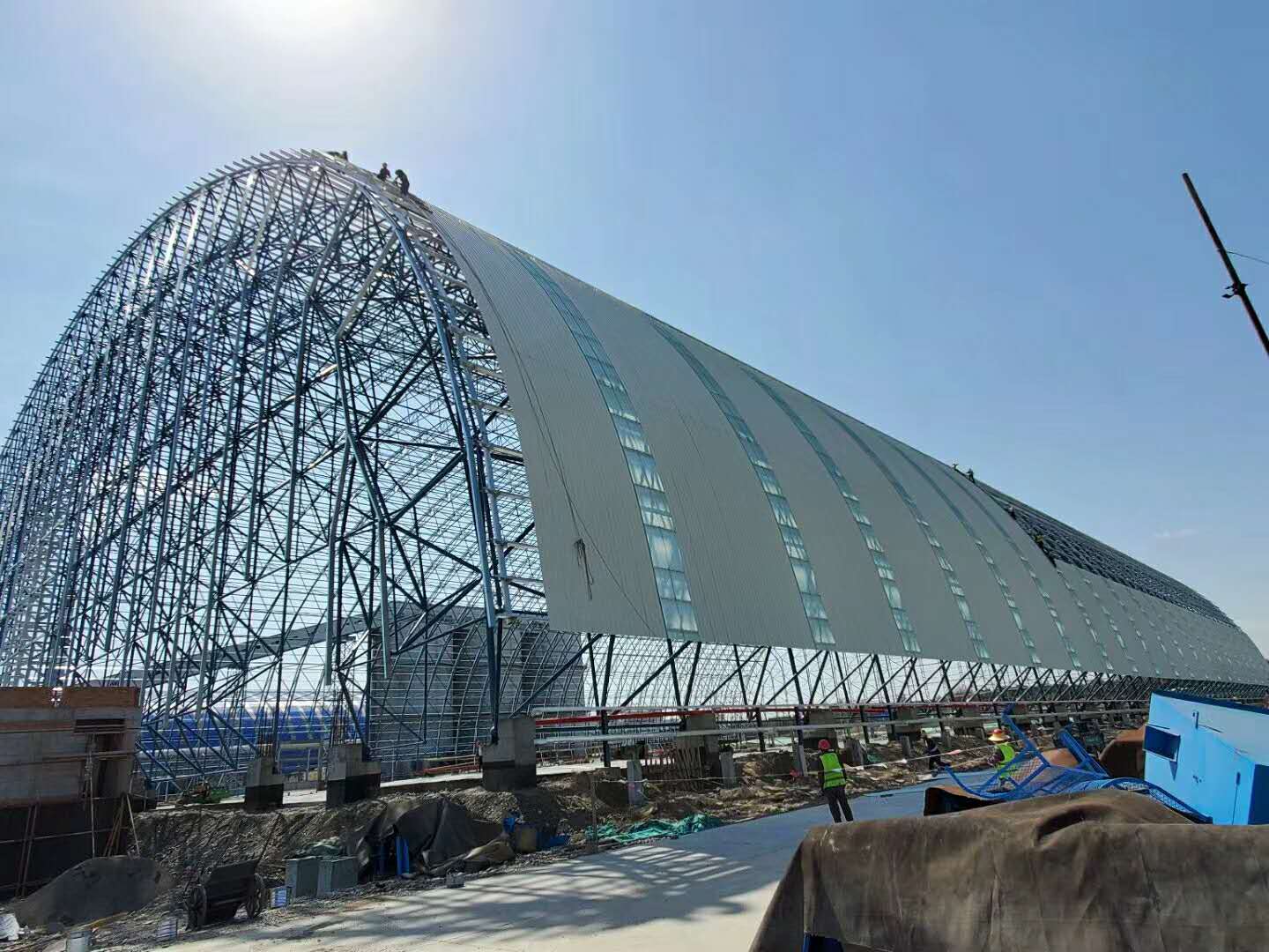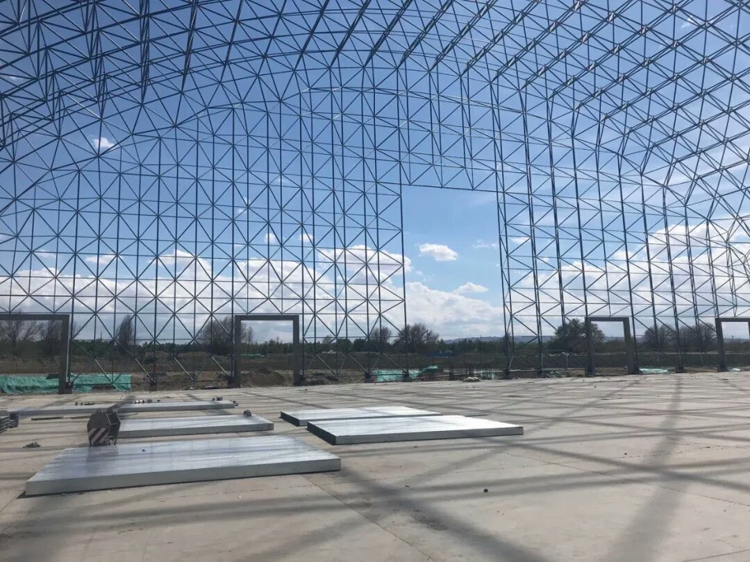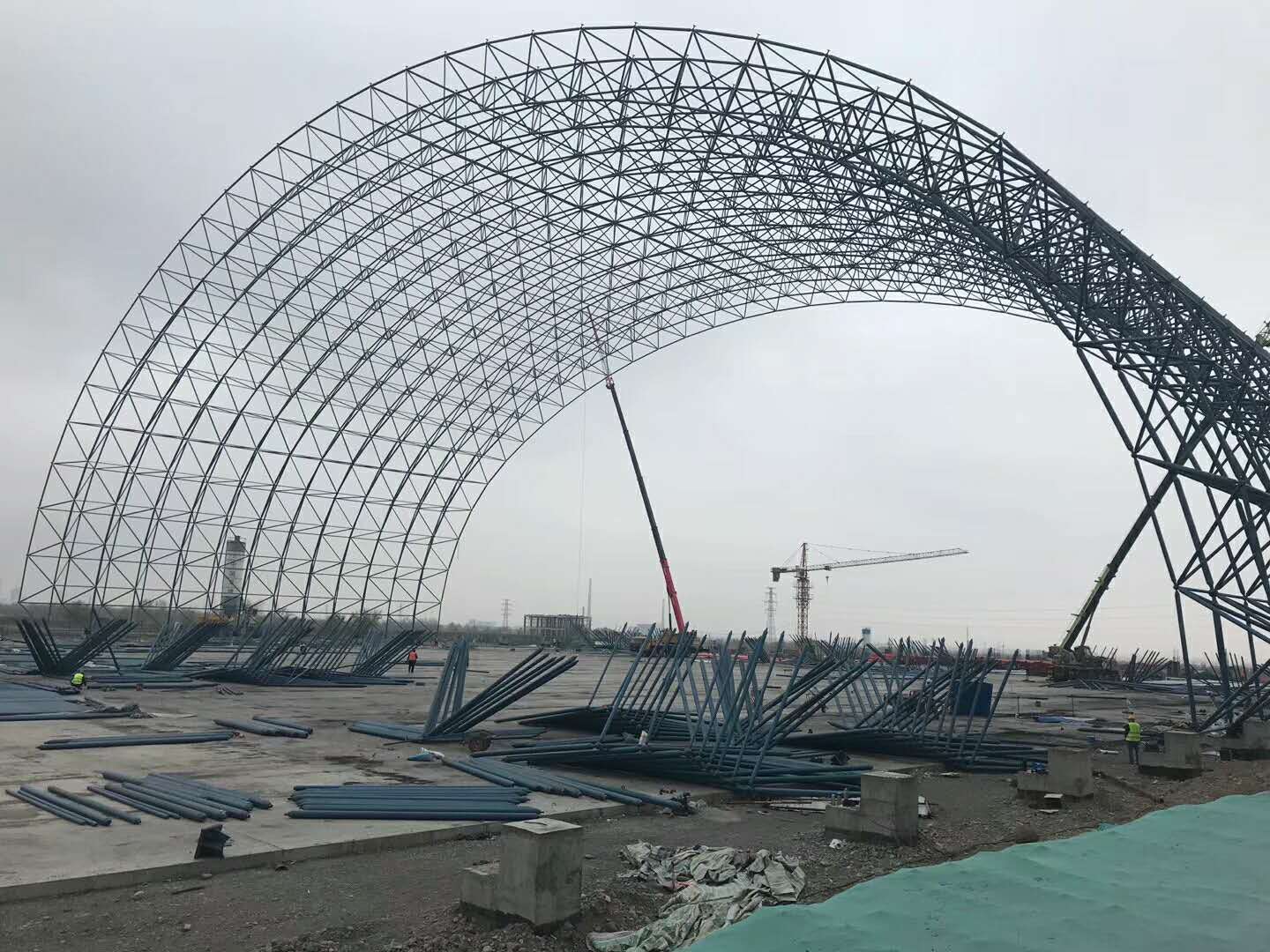 該工程根據工藝專業(yè)的要求,采用螺栓球節(jié)點正放四角錐網殼結構,網架跨度120m,總長180米,高43.39米。網架結構形式:正放四角錐、下弦支撐形式,螺栓球結構、自身找坡,網架結構落地支座間距按9m布置,網架厚度按3.5m設計。屋面采用上鋪彩色涂層壓型鋼彩板和采光帶,端部側面封閉采用彩色涂層壓型鋼板。配套有消防、照明、水電暖等相關設施,極大滿足了環(huán)保、消防和現(xiàn)場使用的要求。