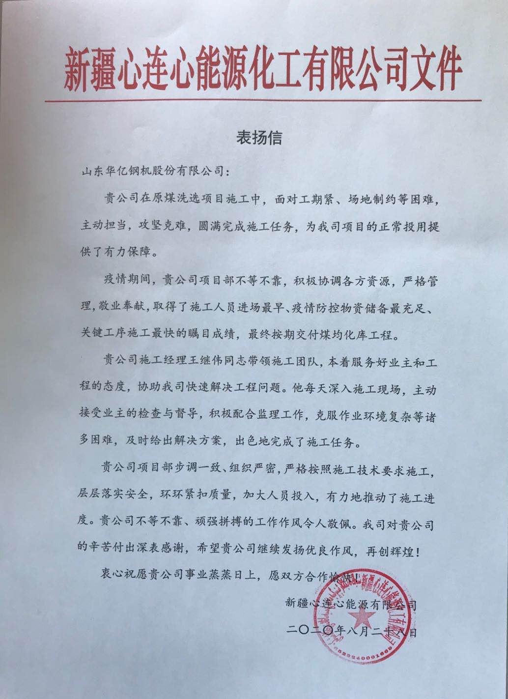 日前,由我司承接施工的新疆心連心能源化工有限公司原煤洗選分級利用項目煤均化庫網架工程順利通過工程竣工驗收,獲業(yè)主方高度認可與贊揚,并向公司發(fā)來表揚信,以示感謝!