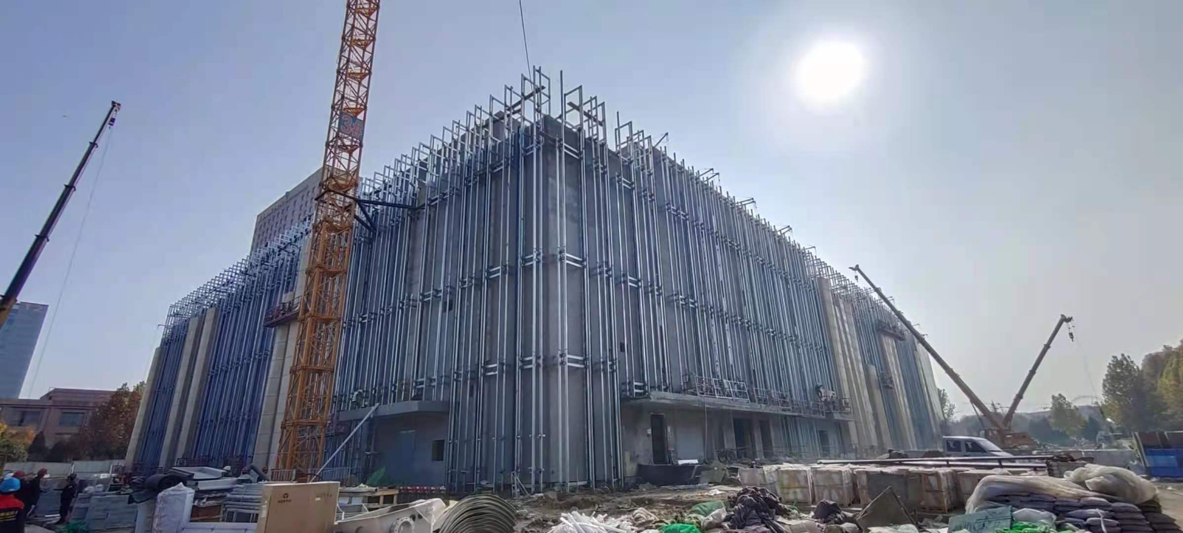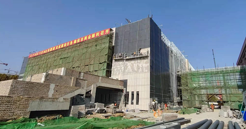 日前,我公司承接的位于濟寧高新區(qū)崇文大道北側(cè)的海達會展中心項目幕墻工程龍骨全部完成,藝術(shù)板及石材浮雕板正在安裝,項目進展有條不紊,井然有序。