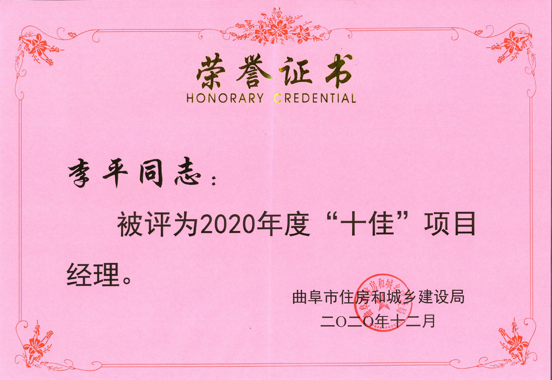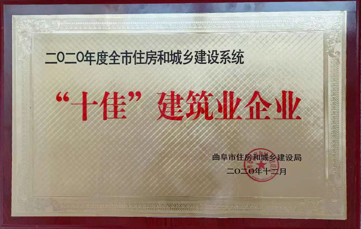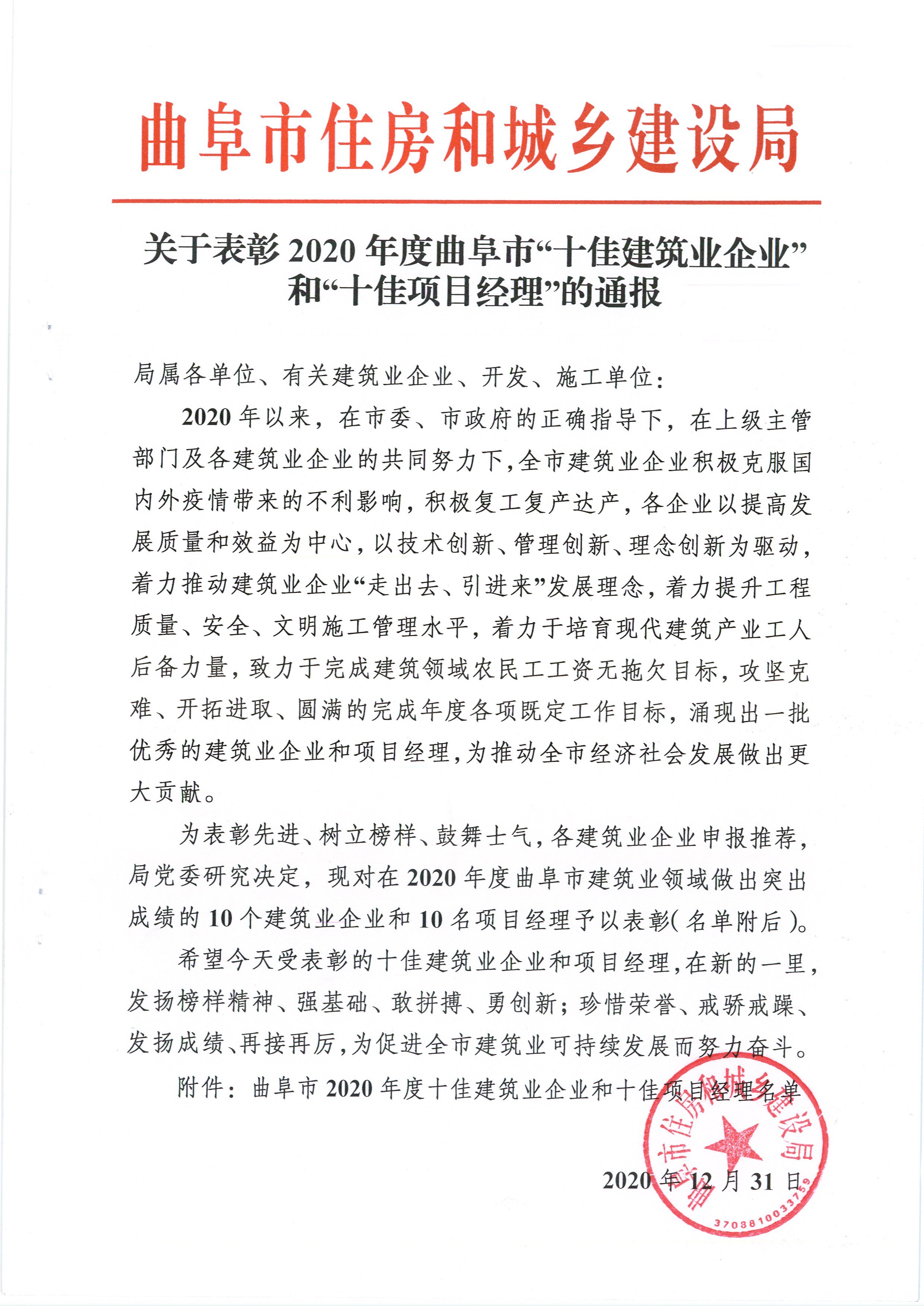 新年伊始,喜訊頻傳。近日,在曲阜市住建局組織召開的2020年度全市建筑業(yè)總結(jié)大會上,我公司榮獲曲阜市“十佳建筑業(yè)企業(yè)”,李平榮獲“十佳項(xiàng)目經(jīng)理”榮譽(yù)稱號。