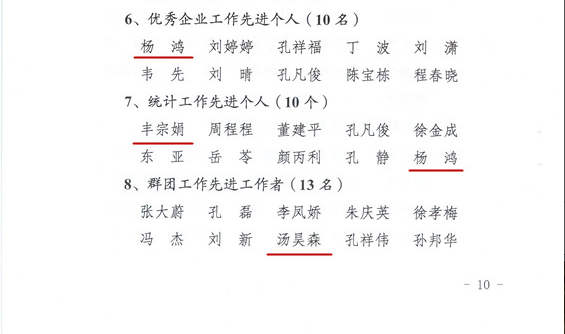 在表彰環(huán)節(jié),我公司被授予“突出貢獻(xiàn)企業(yè)”“管理先進(jìn)企業(yè)”“社會(huì)貢獻(xiàn)突出企業(yè)”多個(gè)榮譽(yù)稱號(hào),楊鴻同志被授予“優(yōu)秀企業(yè)工作先進(jìn)個(gè)人”“統(tǒng)計(jì)工作先進(jìn)個(gè)人”,豐宗娟同志被授予“統(tǒng)計(jì)工作先進(jìn)個(gè)人”,湯昊森同志被授予“群團(tuán)工作先進(jìn)工作者”。