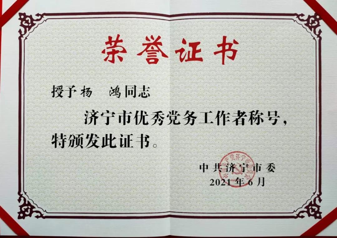 6月30日上午,濟(jì)寧市優(yōu)秀共產(chǎn)黨員、優(yōu)秀黨務(wù)工作者和先進(jìn)基層黨組織表彰大會(huì)在我公司承包施工幕墻項(xiàng)目的濟(jì)寧市圣都會(huì)議中心召開,公司黨支部書記楊鴻同志獲“濟(jì)寧市優(yōu)秀黨務(wù)工作者”榮譽(yù)稱號(hào),這是繼黨支部書記楊鴻同志榮獲曲阜市“紅帆能手”和被濟(jì)寧市委組織部授予“雙強(qiáng)六好”“兩新”組織示范點(diǎn)之后,公司在黨支部建設(shè)方面取得的又一項(xiàng)市級(jí)榮譽(yù)。