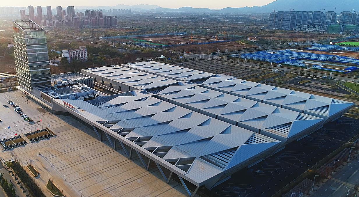 安慶會展中心建設(shè)總規(guī)模10.15萬平方米左右,項目總投資13.5億元。展覽館由5個展廳及南北縱橫的共享大廳組成,總建筑面積約4.2萬平方米,每個展廳凈展面積約5600平方米,建筑高度18米、長108米、寬54米。上部結(jié)構(gòu)均為鋼框架+屈曲約束支撐+張弦桁架,屋面采用鋁鎂錳板金屬屋面。