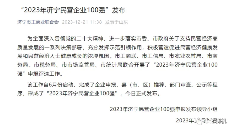 據(jù)了解,為全面深入貫徹黨的二十大精神,進一步落實濟寧市委、市政府關于支持民營經(jīng)濟高質(zhì)量發(fā)展的一系列決策部署,充分發(fā)揮示范引領作用,積極營造促進民營經(jīng)濟健康發(fā)展和民營經(jīng)濟人士健康成長的濃厚氛圍,濟寧市工商聯(lián)、市工信局、市農(nóng)業(yè)農(nóng)村局、市商務局、市稅務局、市市場監(jiān)管局、市統(tǒng)計局聯(lián)合開展了“2023年濟寧民營企業(yè)100強”申報評選工作。該活動自6月份啟動,完成了企業(yè)申報、縣(市、區(qū))推薦、部門審查、公示等程序,形成了“2023年濟寧民營企業(yè)100強”,于12月21日正式發(fā)布。