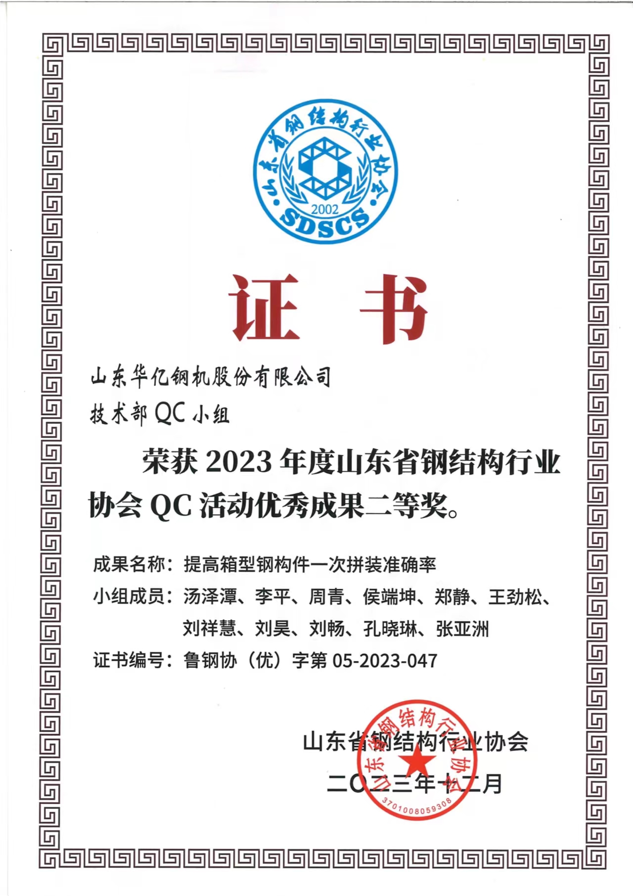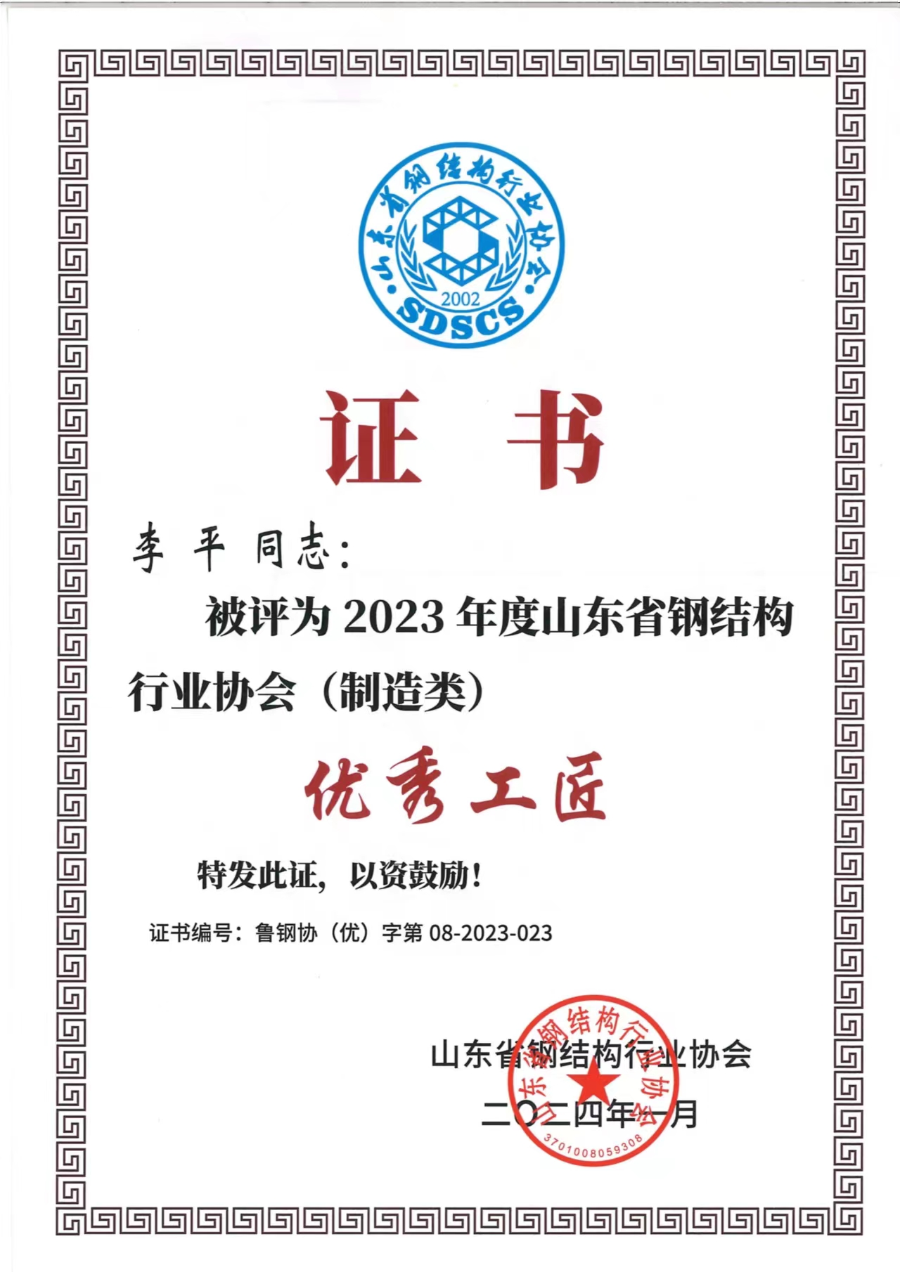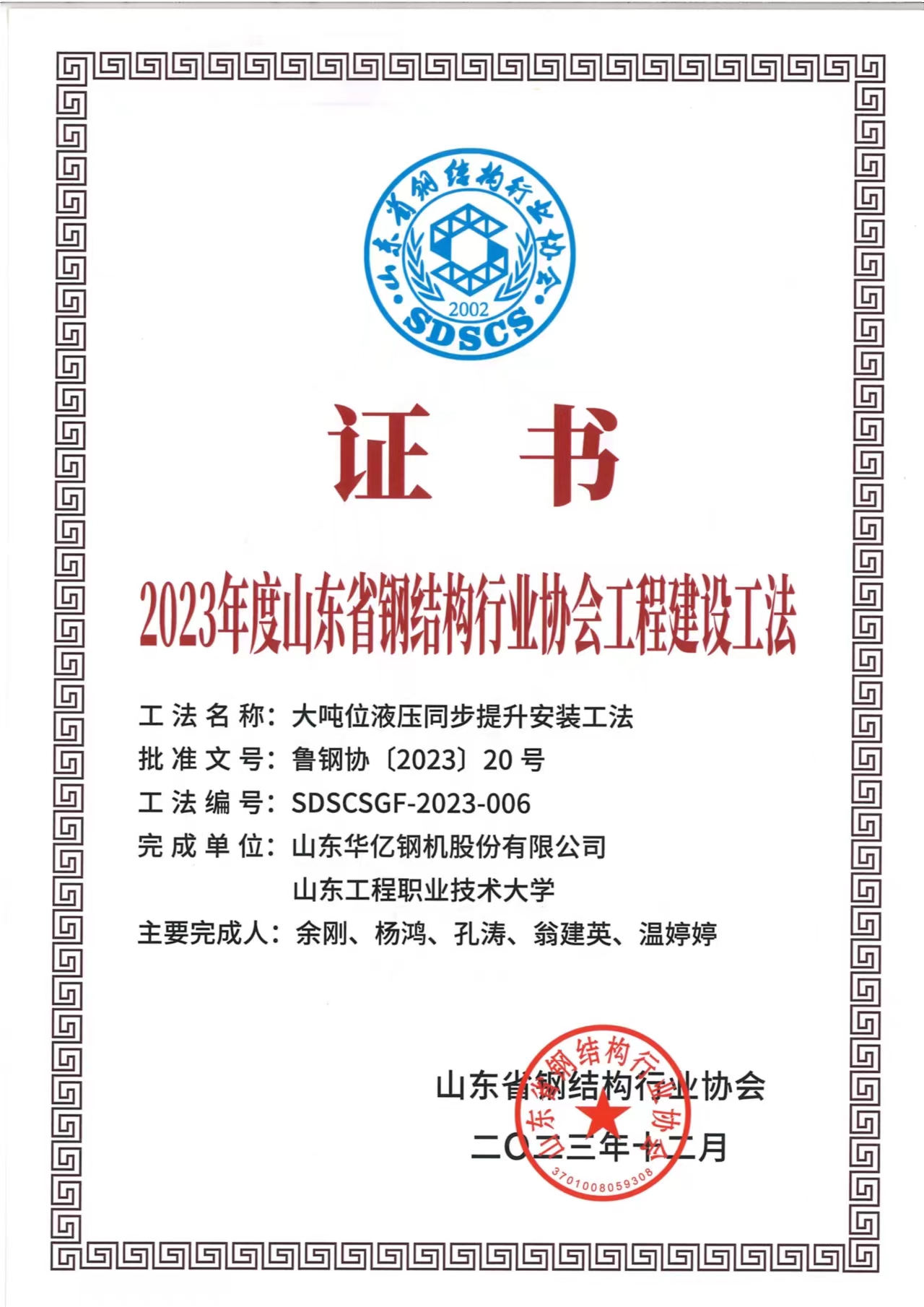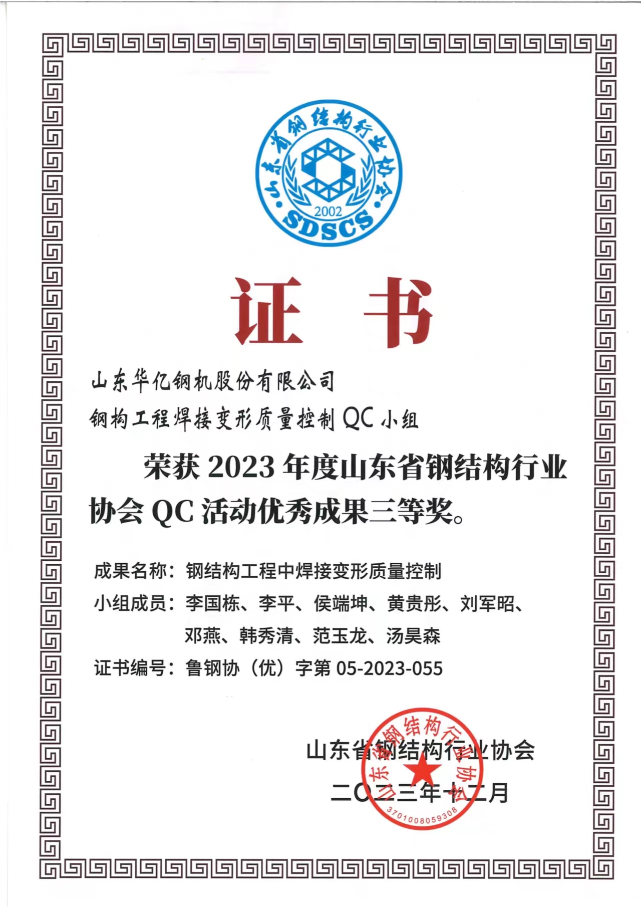 由公司承建的遼陽路快速路(福州路—海爾路)段工程(施工)榮獲2023年度山東省鋼結(jié)構(gòu)行業(yè)協(xié)會鋼結(jié)構(gòu)金獎、孔令帥榮獲突出貢獻項目經(jīng)理,公司榮獲2023年度山東省鋼結(jié)構(gòu)行業(yè)協(xié)會科技創(chuàng)新優(yōu)秀企業(yè),公司副總經(jīng)理李平榮獲2023年度山東省鋼結(jié)構(gòu)行業(yè)協(xié)會(制造類)優(yōu)秀工匠,“大噸位液壓同步提升安裝工法”入選2023年度山東省鋼結(jié)構(gòu)行業(yè)協(xié)會工程建設(shè)工法名單,公司技術(shù)部QC小組榮獲2023年度山東省鋼結(jié)構(gòu)行業(yè)協(xié)會QC活動優(yōu)秀成功二等獎,公司鋼構(gòu)工程焊接變形質(zhì)量控制QC小組榮獲2023年度山東省鋼結(jié)構(gòu)行業(yè)協(xié)會QC活動優(yōu)秀成果三等獎。