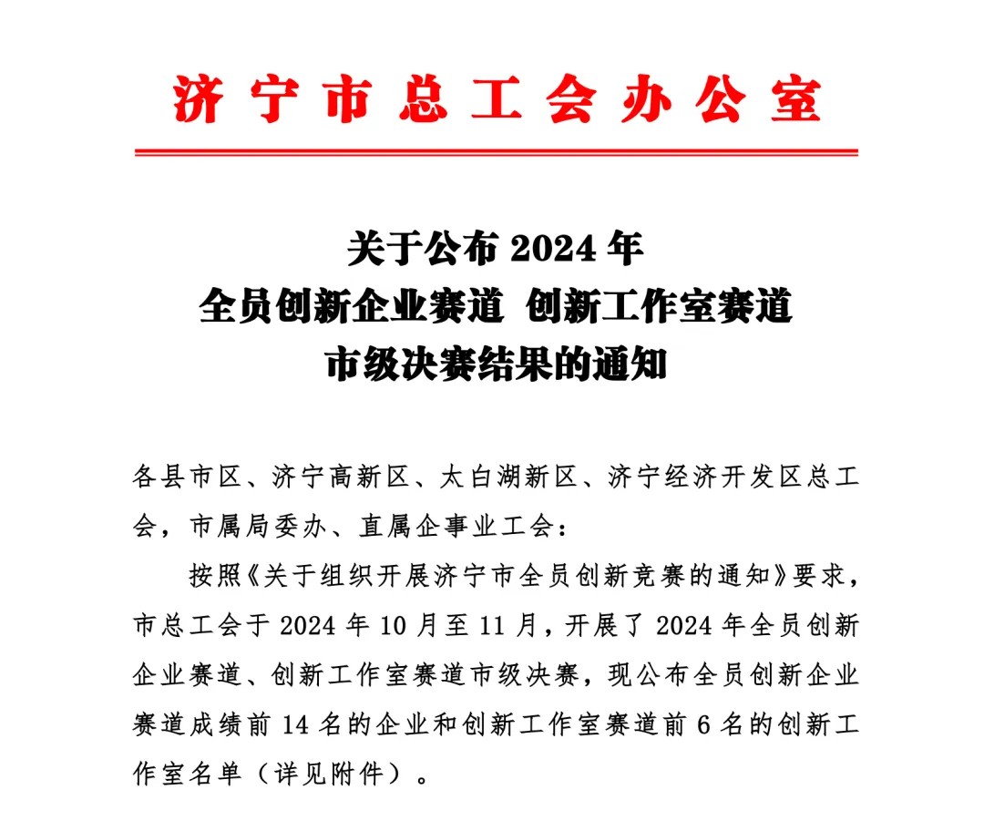 近日,濟寧市總工會發(fā)布了“關(guān)于公布2024年全員創(chuàng)新企業(yè)賽道市級決賽結(jié)果的通知”,公司被評為濟寧市“全員創(chuàng)新企業(yè)賽道”第一名,榮獲“濟寧市全員創(chuàng)新企業(yè)”榮譽稱號。這一榮譽的獲得,是對公司全體員工積極投身于創(chuàng)新實踐的肯定,也是對公司長期以來堅持創(chuàng)新驅(qū)動發(fā)展戰(zhàn)略的認可。