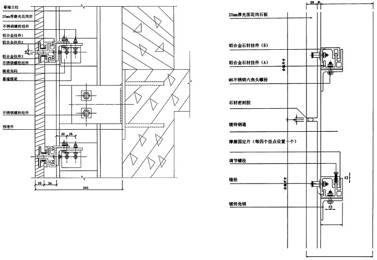 面板為各種石材板或人造板,通過連接件和龍骨安裝掛接在主體結(jié)構(gòu)上的幕墻形式。