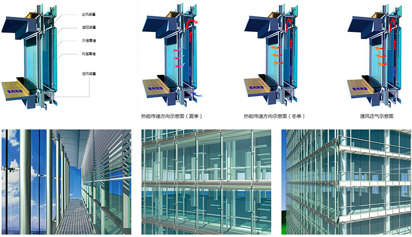 雙層幕墻系統(tǒng)是由內(nèi)、外兩層幕墻組成,并在兩層幕墻中間形成一個換氣通道,通過幕墻通風設(shè)備的開關(guān)可使雙層幕墻中間進入或逸出空間,開窗后房間可進行自然通風,幕墻中間的遮陽裝置可控制太陽光的輻射熱對室內(nèi)溫度的影響。其設(shè)計原理是實現(xiàn)節(jié)能、環(huán)保,使室內(nèi)生活工作環(huán)境與室外自然環(huán)境達到融合。