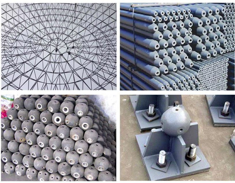 網(wǎng)架結(jié)構(gòu)的桿件截面應(yīng)根據(jù)強(qiáng)度和穩(wěn)定性計(jì)算確定。為減小壓桿的計(jì)算長度增加其穩(wěn)定性,可采用增設(shè)再分桿及支撐桿等措施。用鋼材制作的板型網(wǎng)架及雙層殼型網(wǎng)架的節(jié)點(diǎn),主要有十字板節(jié)點(diǎn)、焊接空心球節(jié)點(diǎn)及螺栓球節(jié)點(diǎn)三種形式。十字板節(jié)點(diǎn)適用于型鋼桿件的網(wǎng)架結(jié)構(gòu),桿件與節(jié)點(diǎn)板的連接,采用焊接或高強(qiáng)螺栓連接??招那蚬?jié)點(diǎn)及螺栓球節(jié)點(diǎn)適用于鋼管桿件的網(wǎng)架結(jié)構(gòu)。單層殼型網(wǎng)架的節(jié)點(diǎn)應(yīng)能承受彎曲內(nèi)力,一般情況下,節(jié)點(diǎn)的耗鋼量占整個(gè)鋼網(wǎng)架結(jié)構(gòu)用鋼量的15~20%。